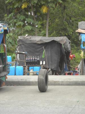 "Tankstelle". Zwischen den Dörfern wird das Benzin in Cola-Flaschen verkauft.
